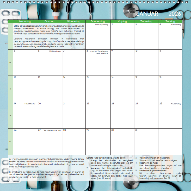 Naast alle Nederlandse feestdagen bevat deze kalender bijna 200 extra dagen om te vieren, bij stil te staan of ter inspiratie. Zeker voor EHBO-instructeurs is de EHBO-kalender een leuke bron van inspiratie voor de herhalingslessen. Elke maand wordt een ander onderwerp uit de EHBO uitgelicht