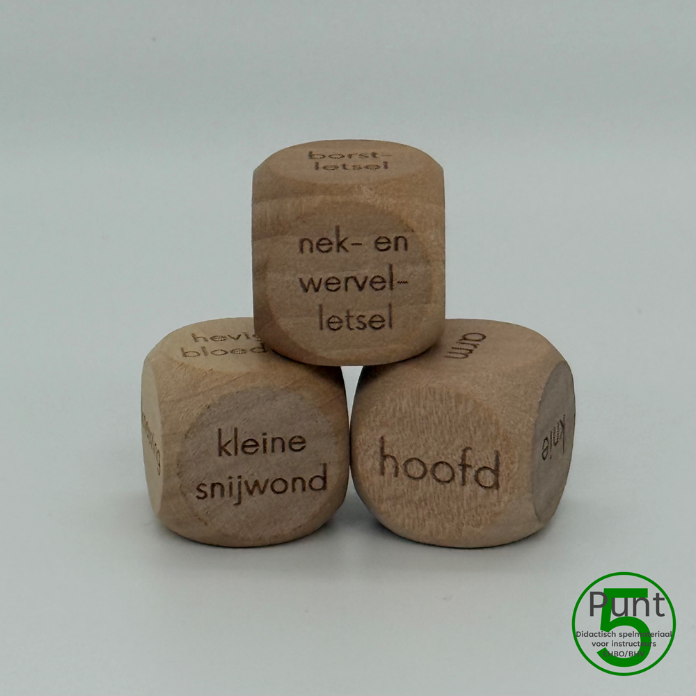 Met het Dobbelspel Verbandleer bepalen de dobbelstenen welke wond op welk lichaamsdeel verbonden moet worden. Dobbel je twee keer achter elkaar hetzelfde? Zeker in herhalingslessen is het leuk om steeds een andere methode te moeten toepassen. Hoe creatief zijn jouw cursisten… 🙂