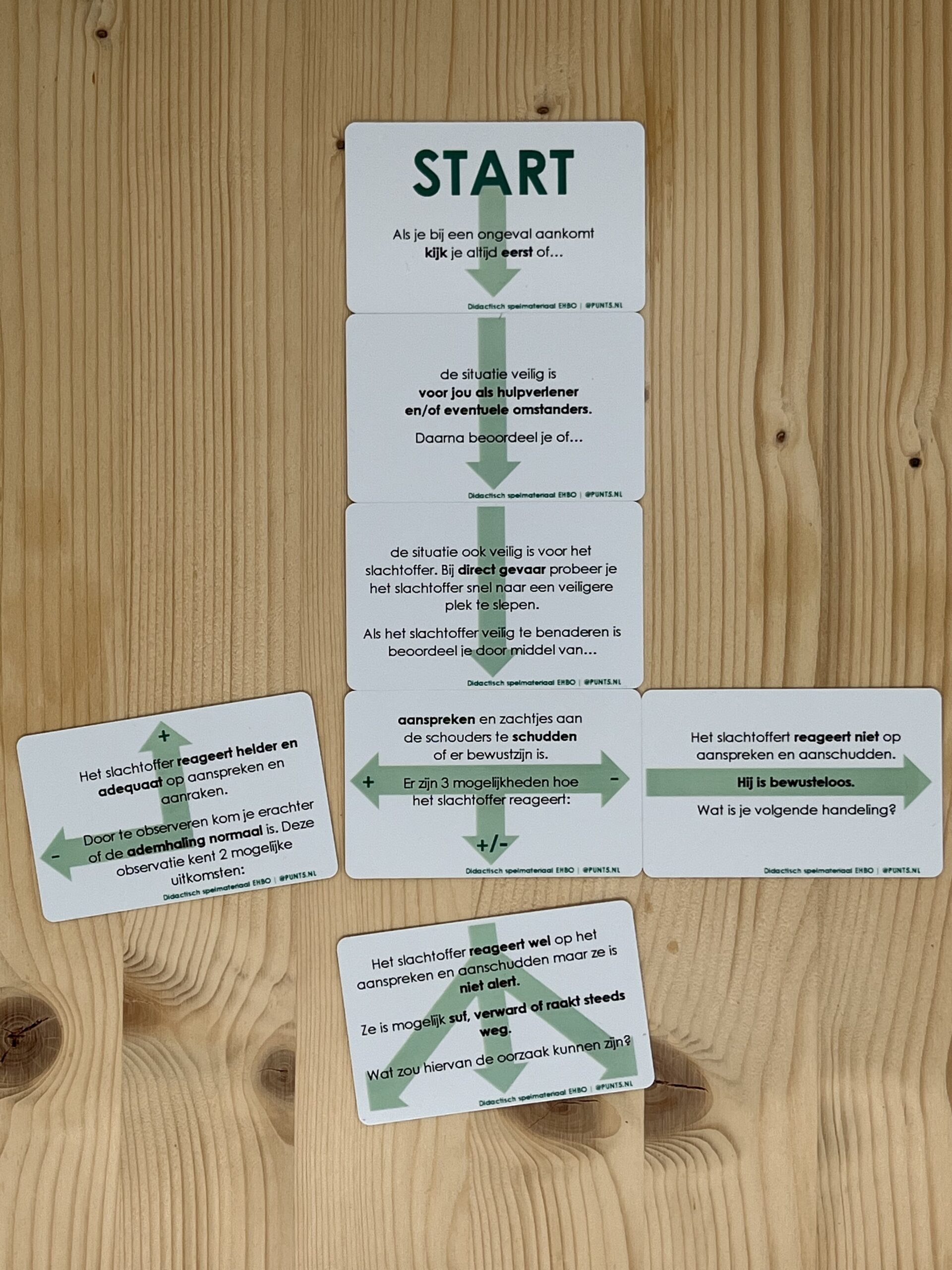 Zo zijn er meerdere punten in de hulpverlening waarbij je keuzes moet maken. Op elk van die punten vertakt de domino zich en krijg je een domino-diagram. Het grote voordeel hiervan is dat de hersenen de informatie op deze manier veel beter onthouden. Aan het eind heb je een volledig, helder en duidelijk overzicht van het verlenen van Eerste Hulp.